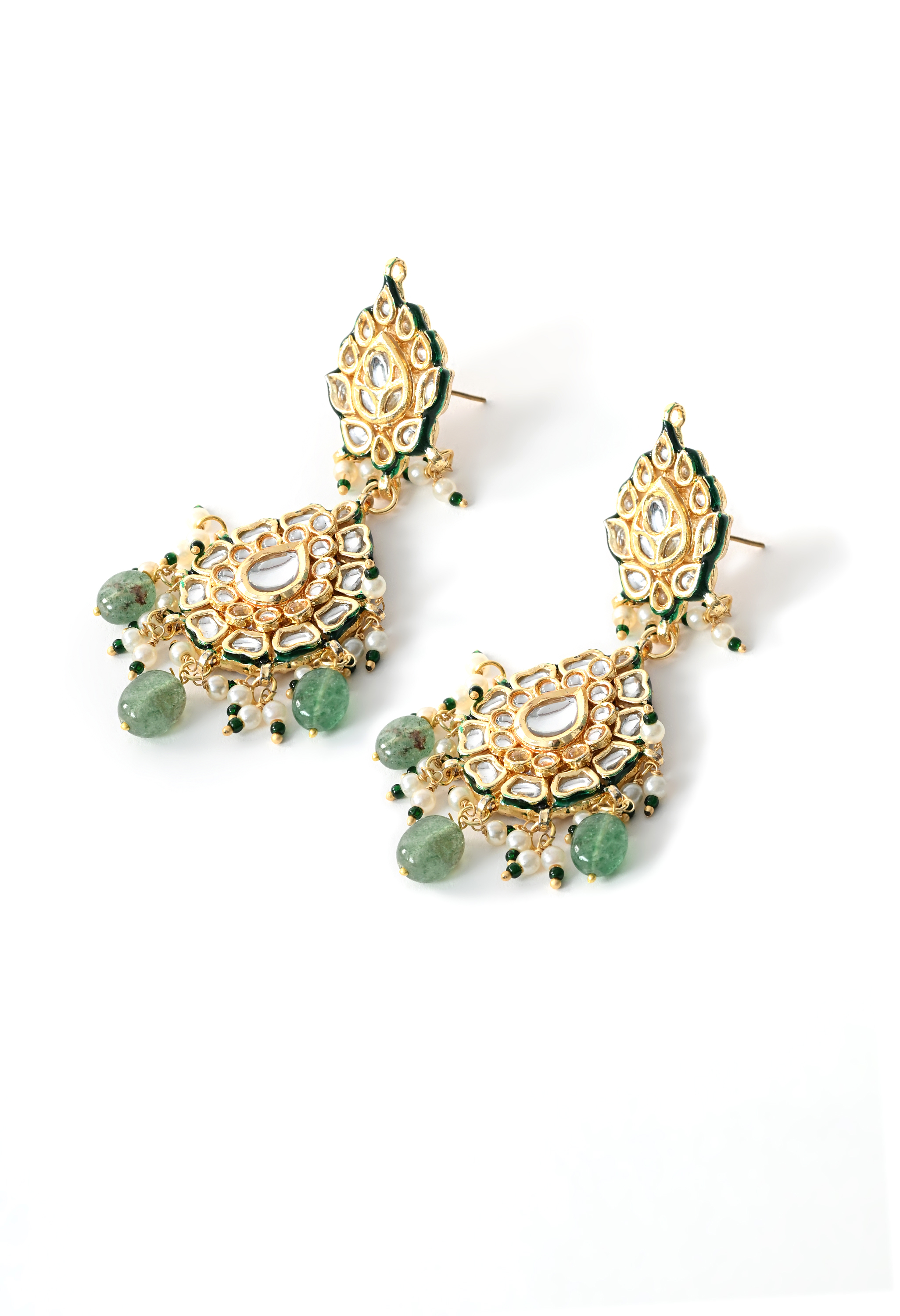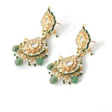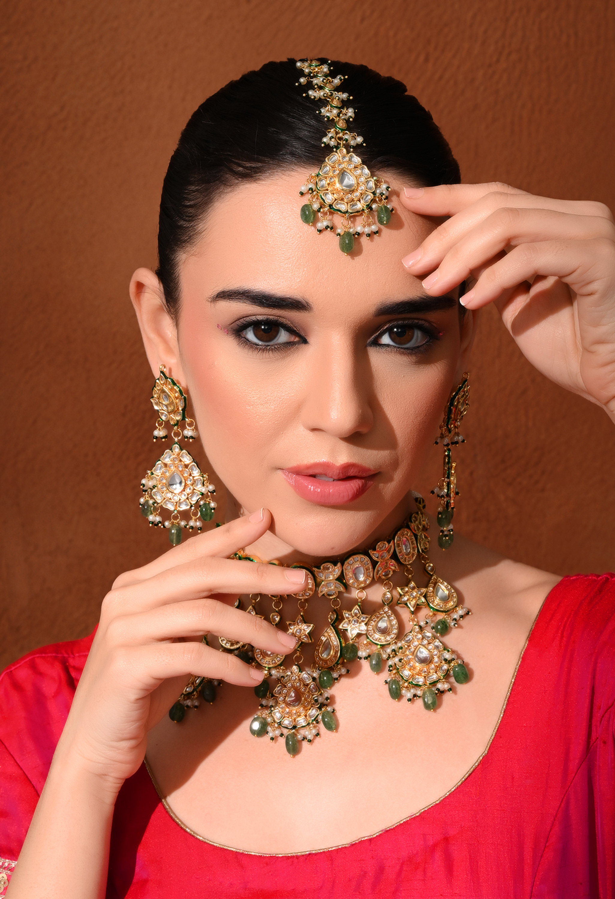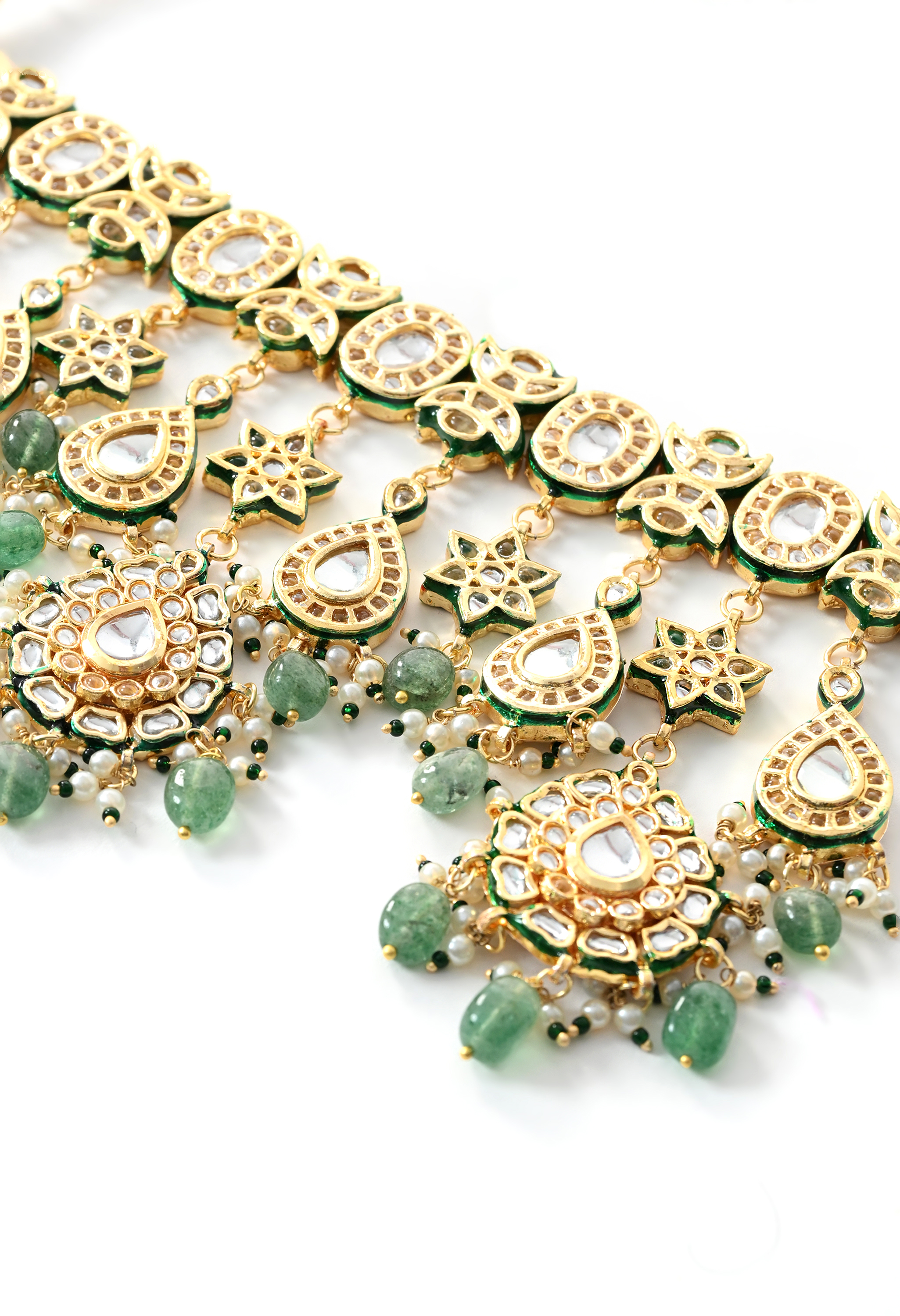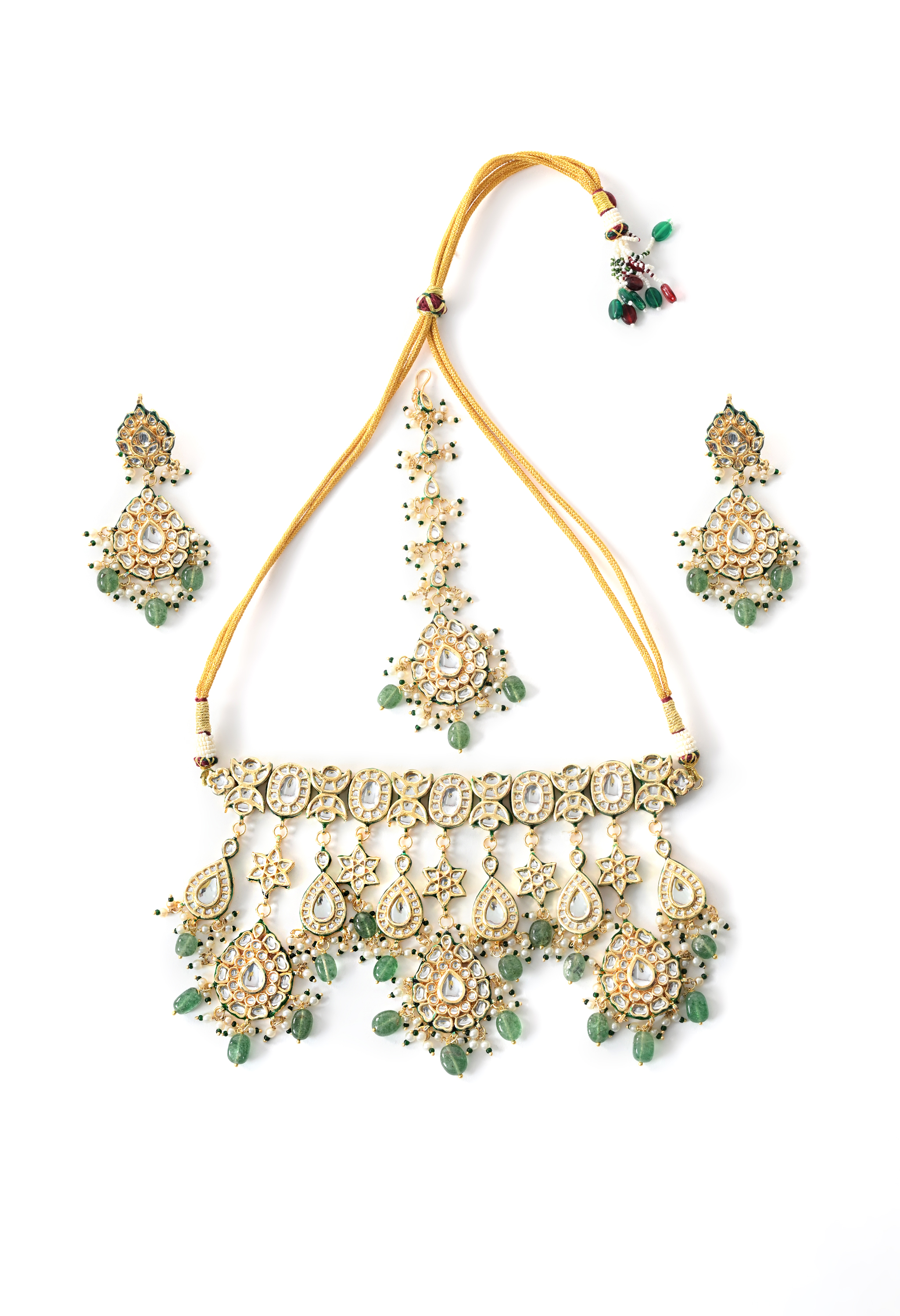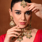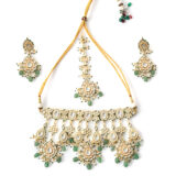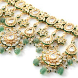 A luxurious bridal choker set designed for grand occasions. Embellished with rich green Kundan Polki stones and gold plating, this complete set includes necklace, earrings, and extra pieces for a full bridal look.