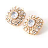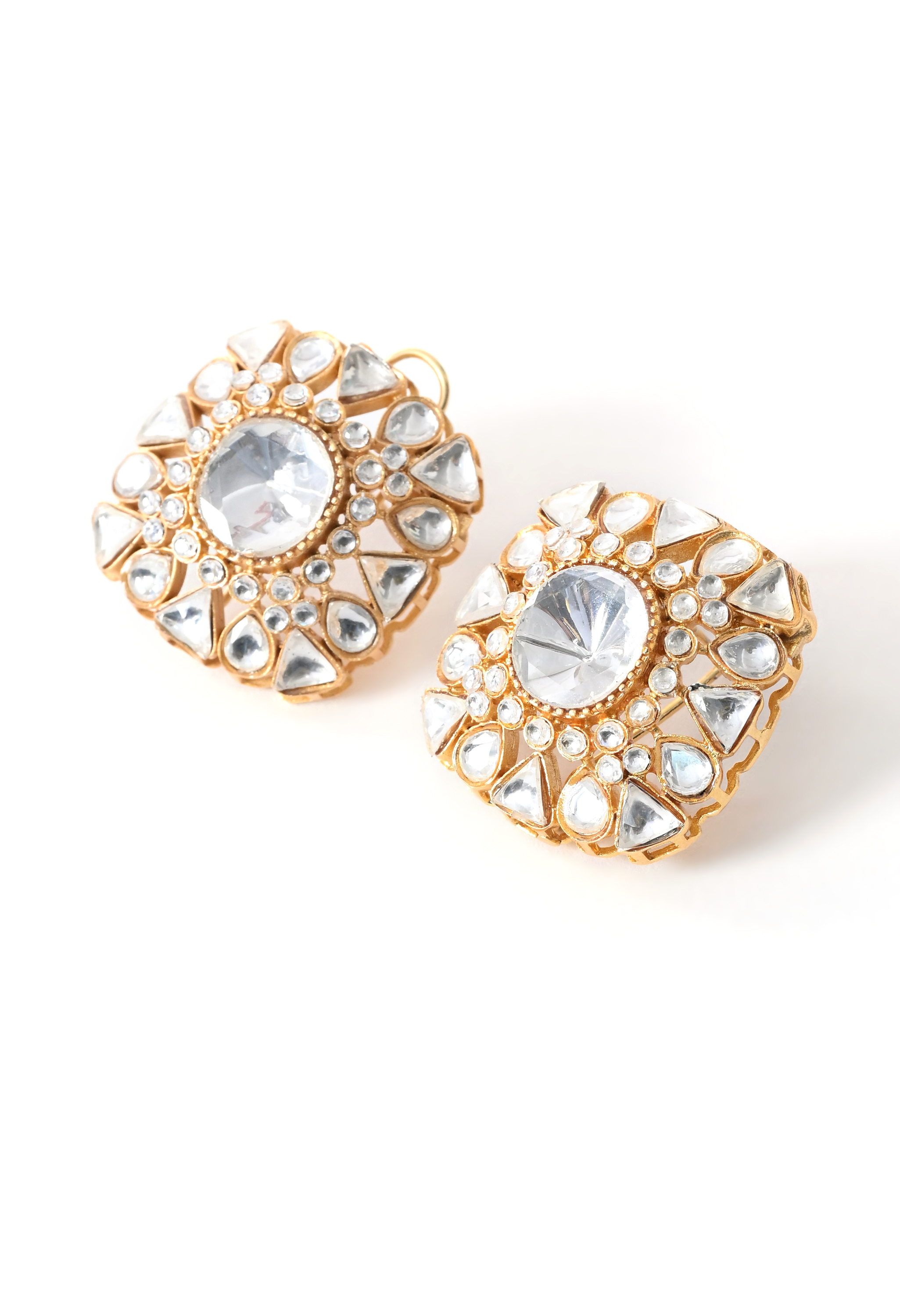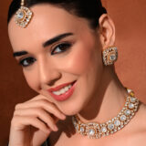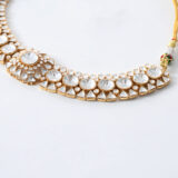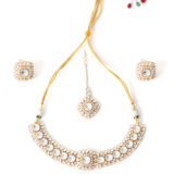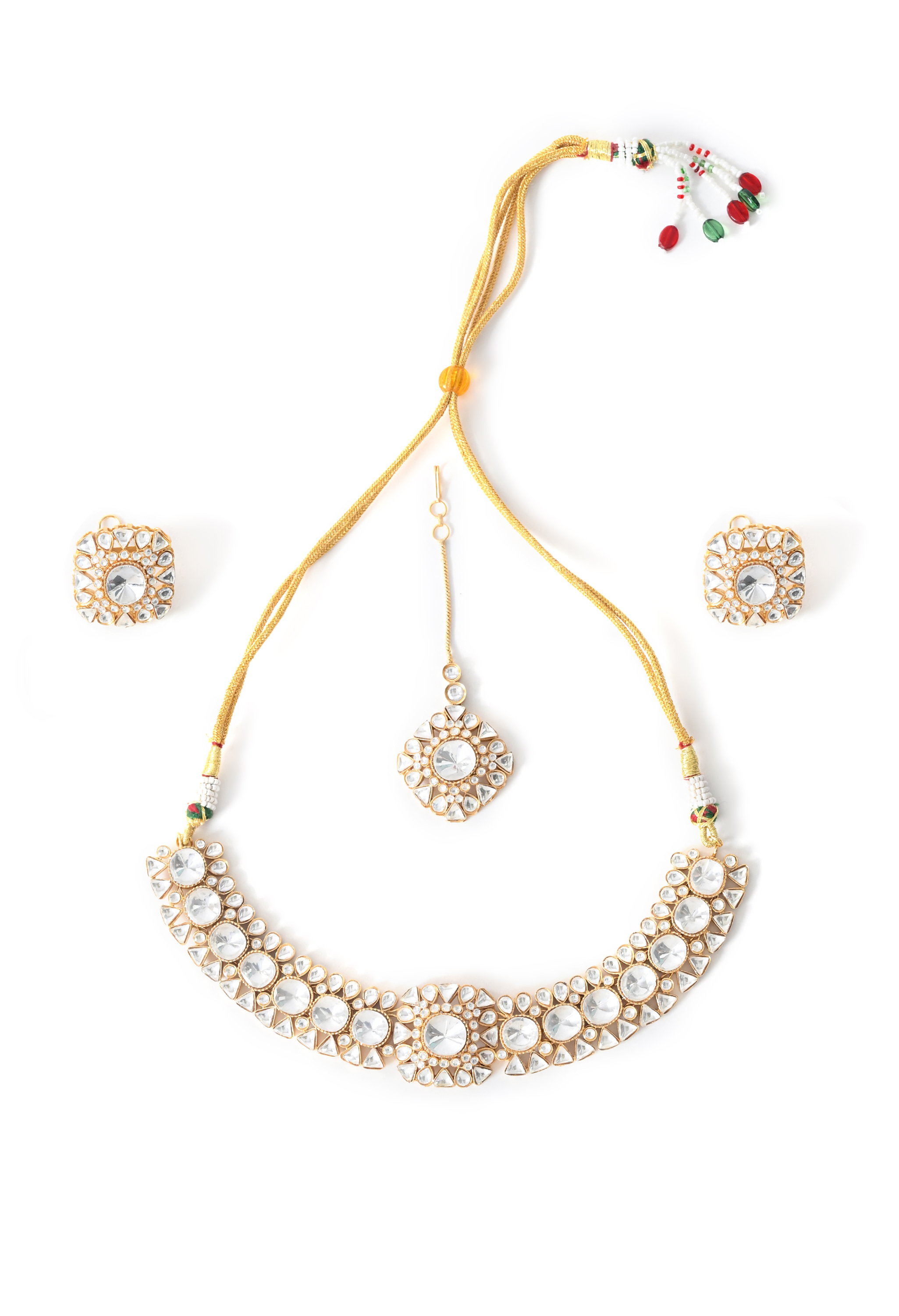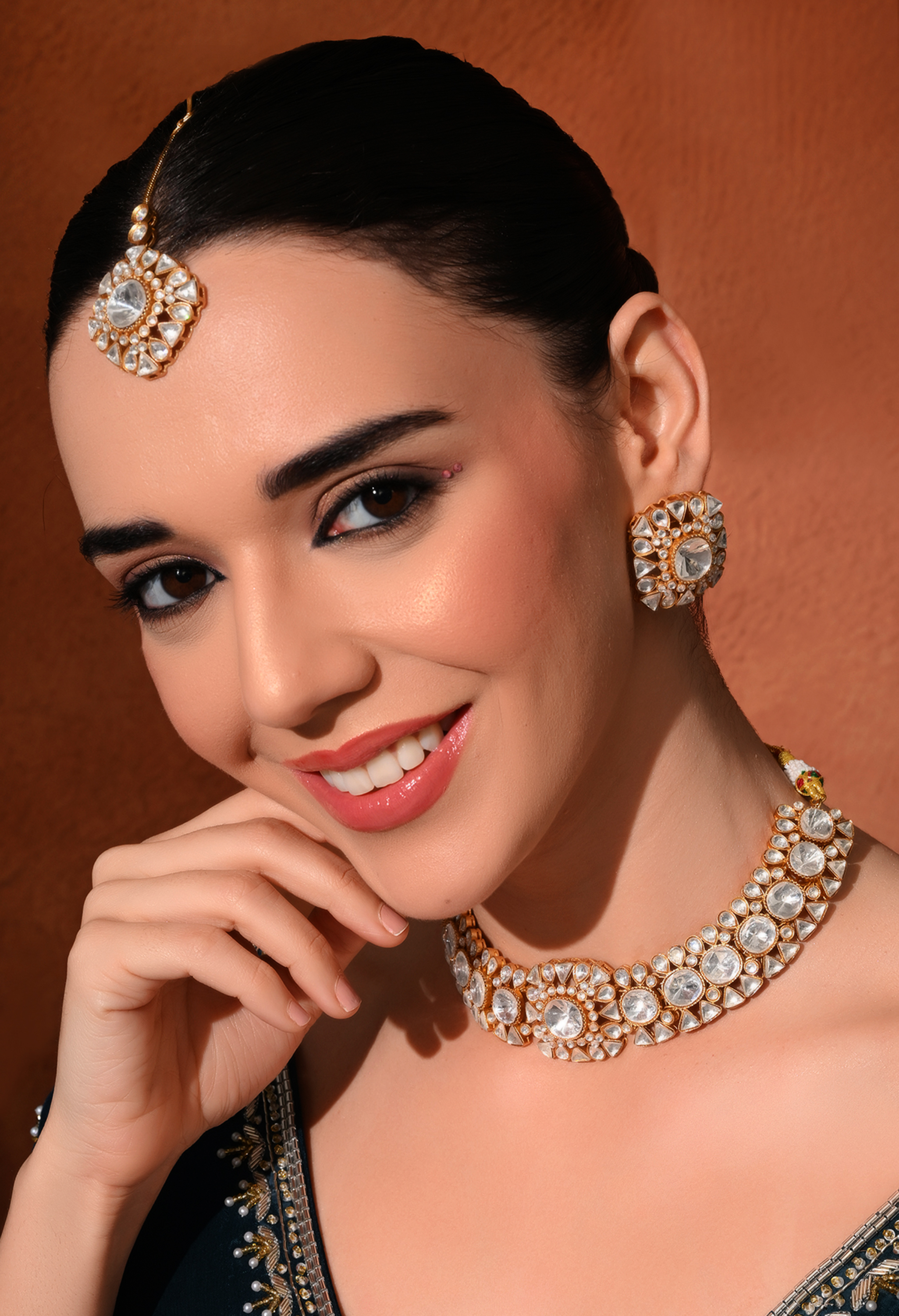 Elegant bridal set including choker, earrings, and mangtika. Crafted with colourless stones and gold plating for a graceful, sophisticated bridal look.