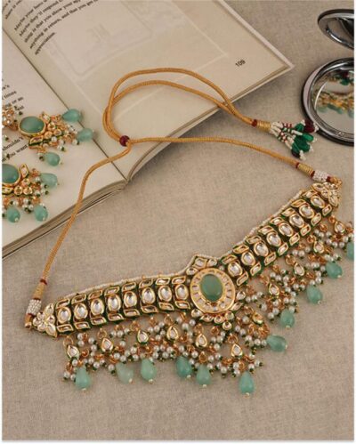Elevate your look with this stunning gold-finish choker set, featuring uncut Polki stones and intricate Kundan detailing. Paired with matching earrings, it’s perfect for weddings, parties, and festive occasions. Timeless elegance in every piece.