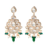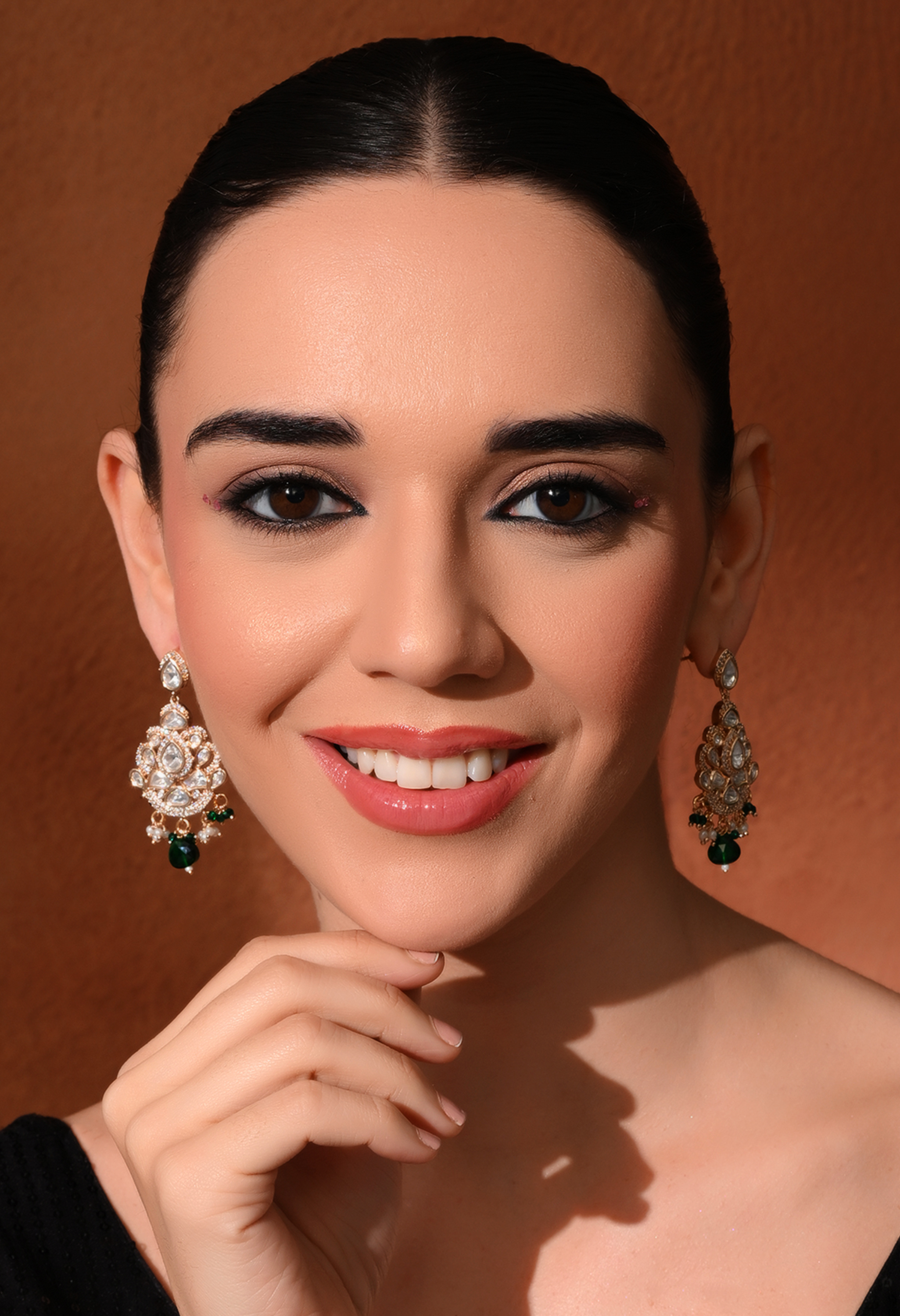 Premium handcrafted danglers featuring green Kundan stones and intricate patterns. Lightweight yet stylish for special occasions.