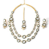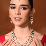 A majestic long necklace set featuring green stones, earrings, and mangtika. Designed to create a grand bridal or festive statement.