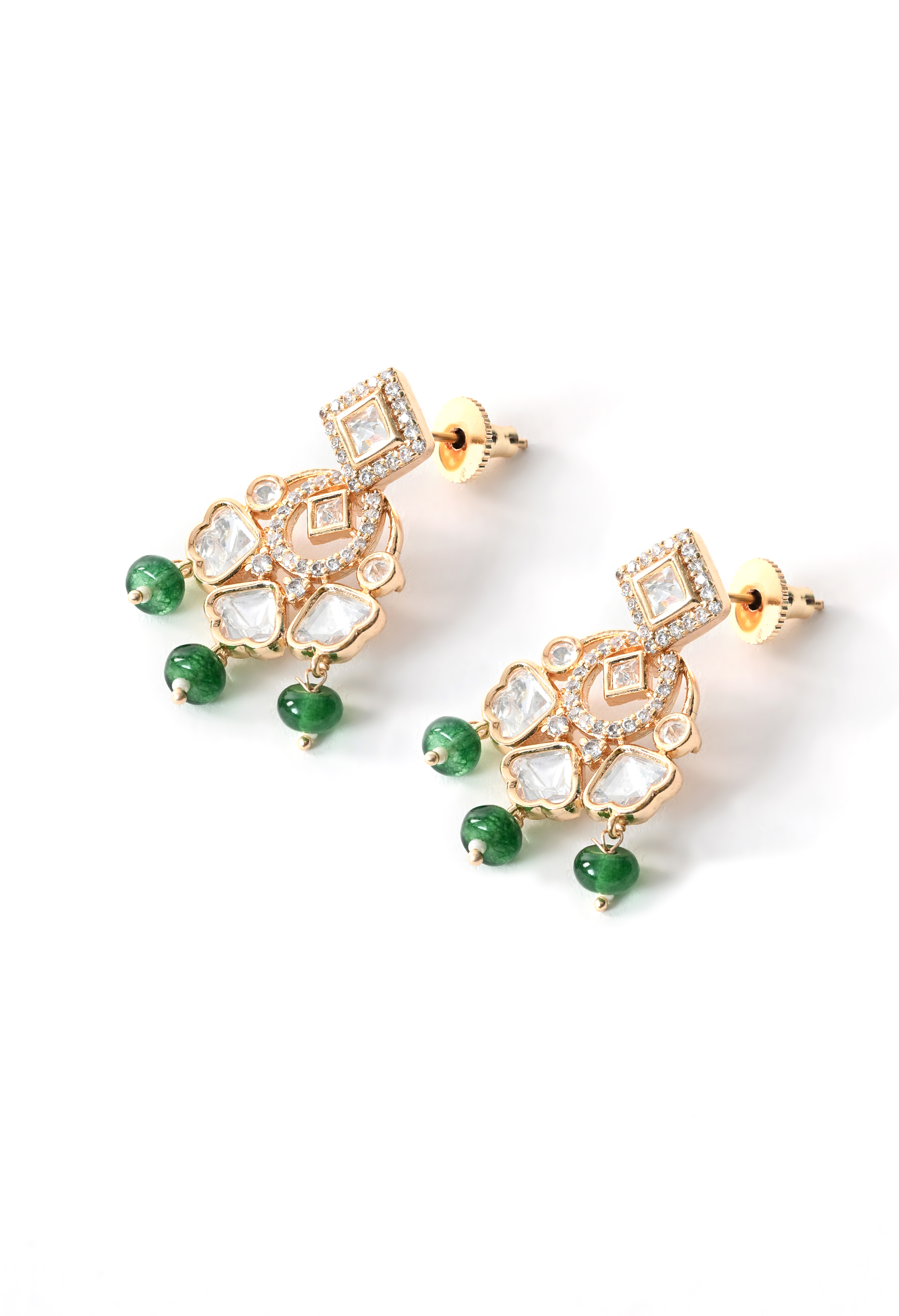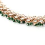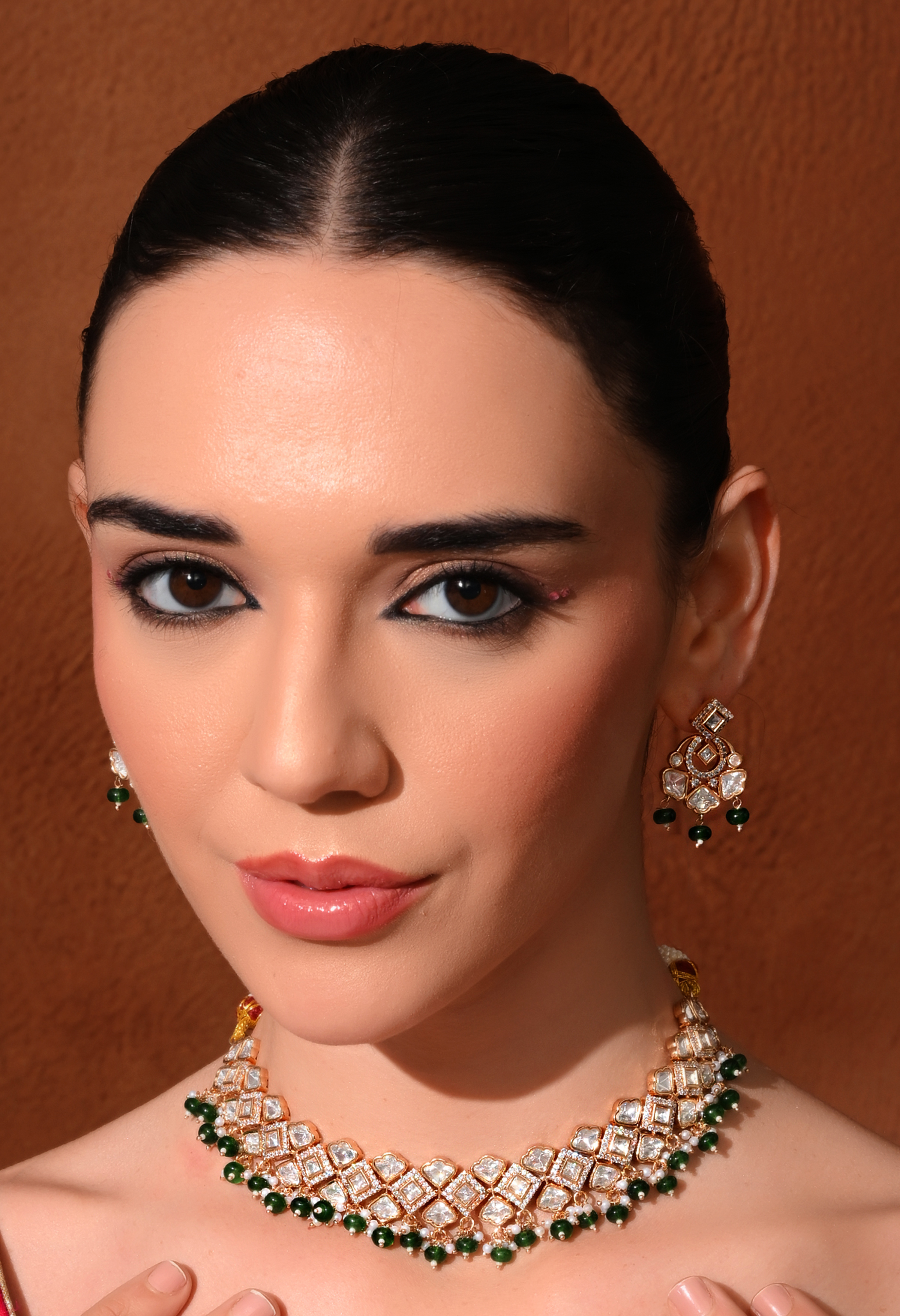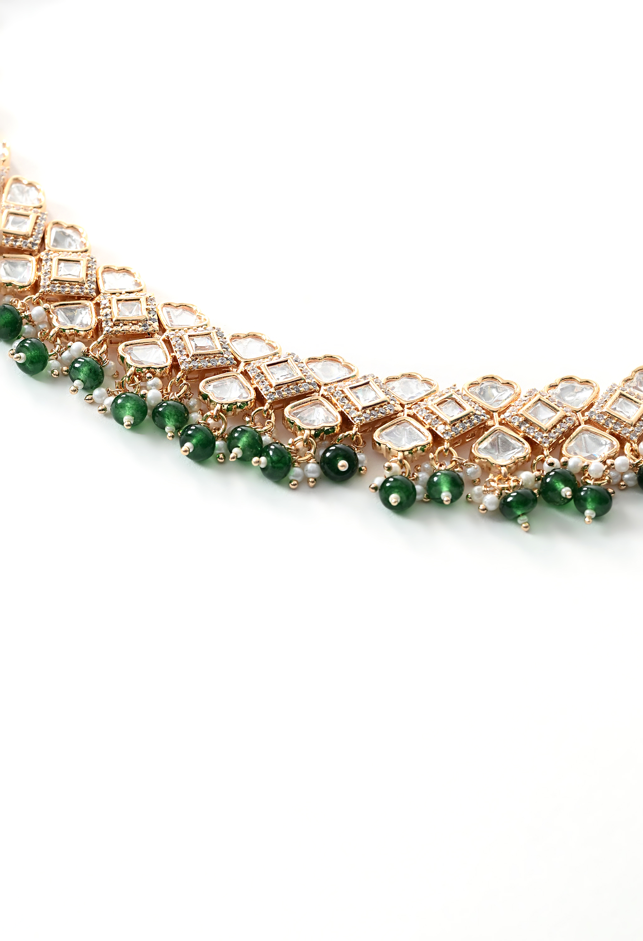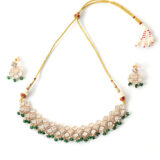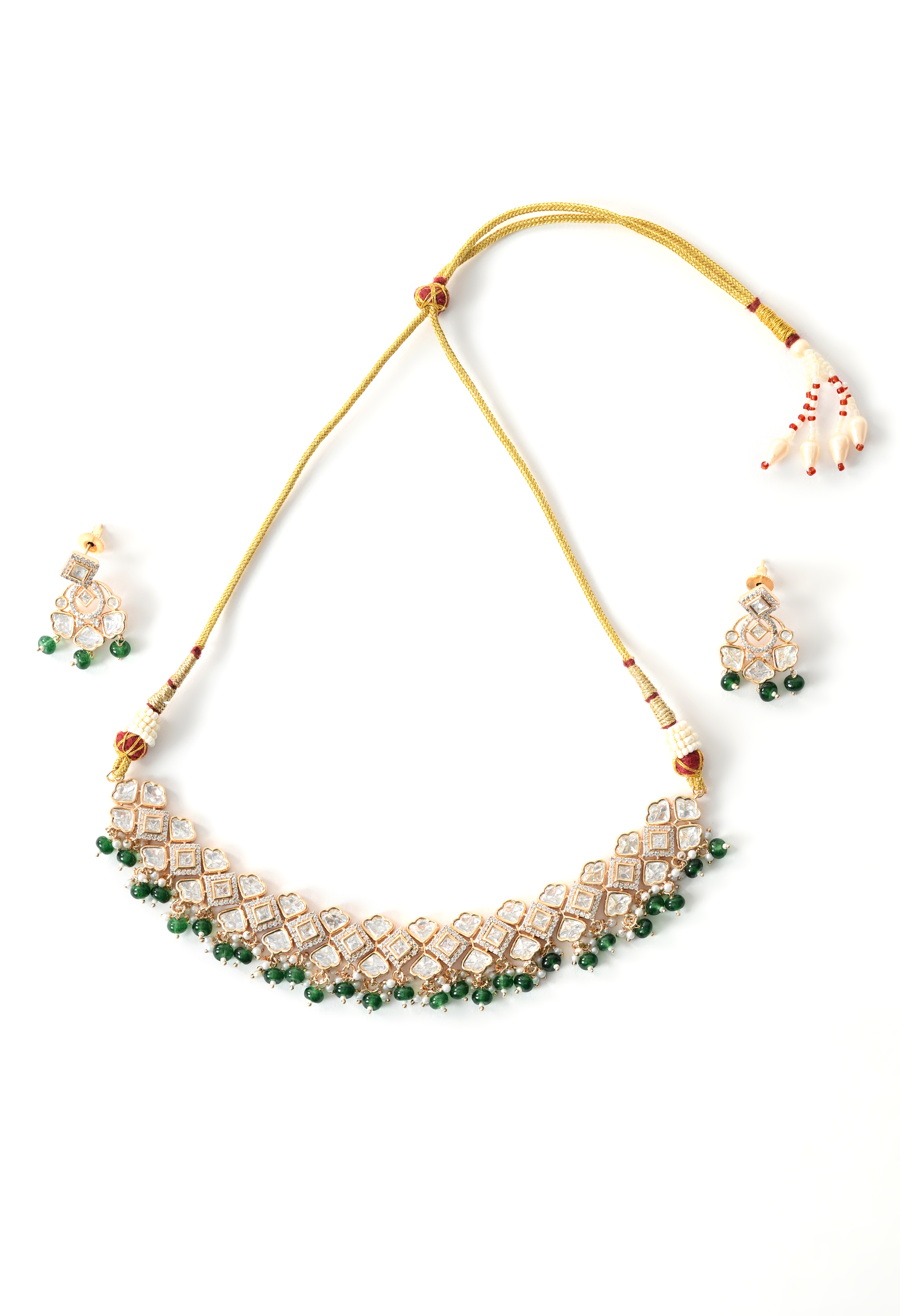 Simple yet elegant green necklace set with subtle Kundan accents. Lightweight and suitable for everyday ethnic styling.
