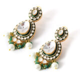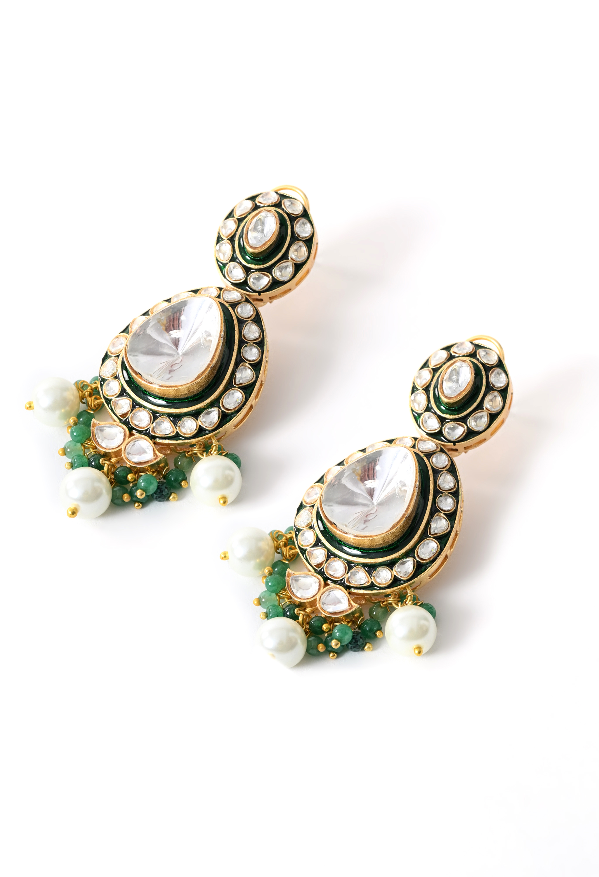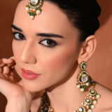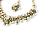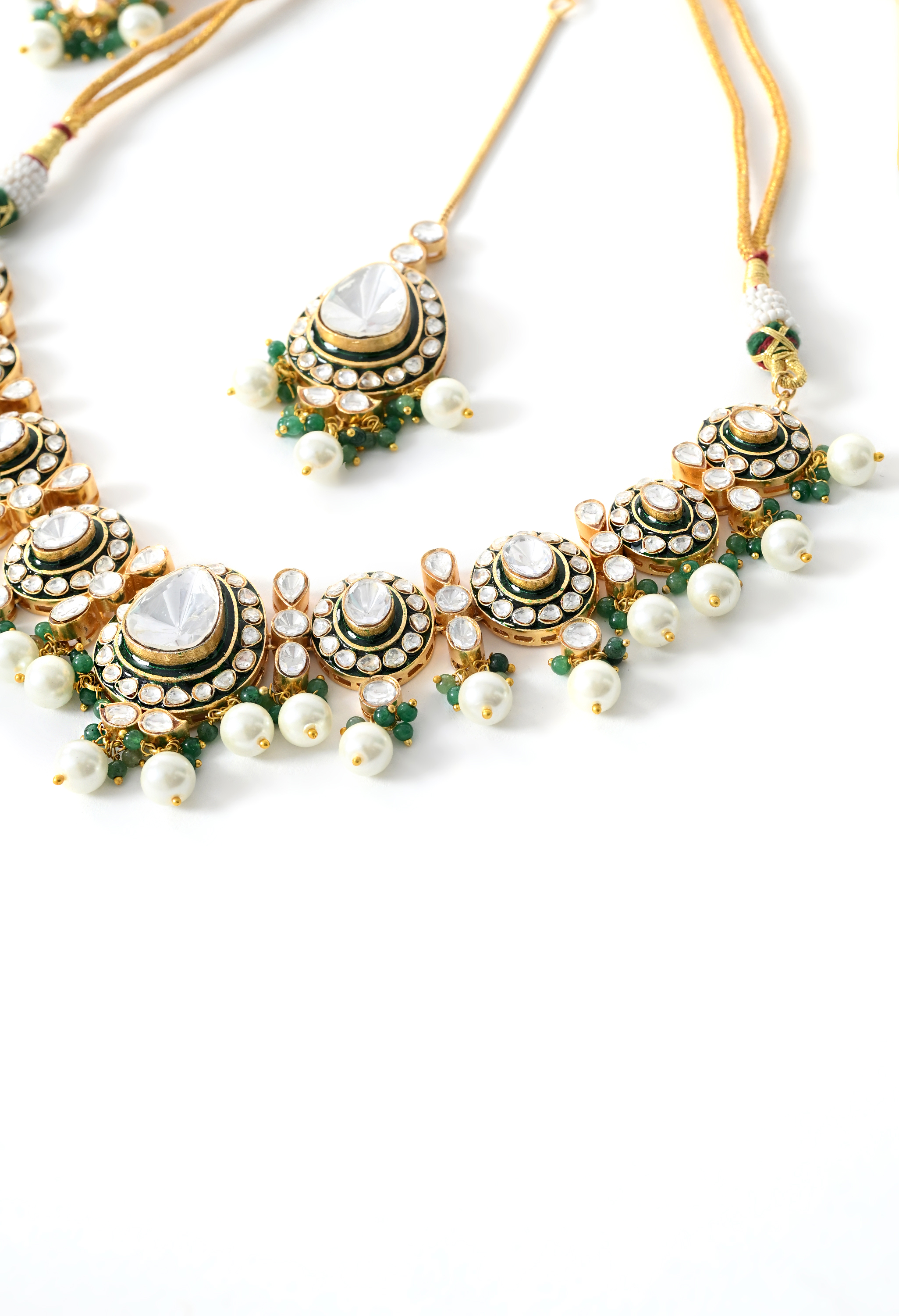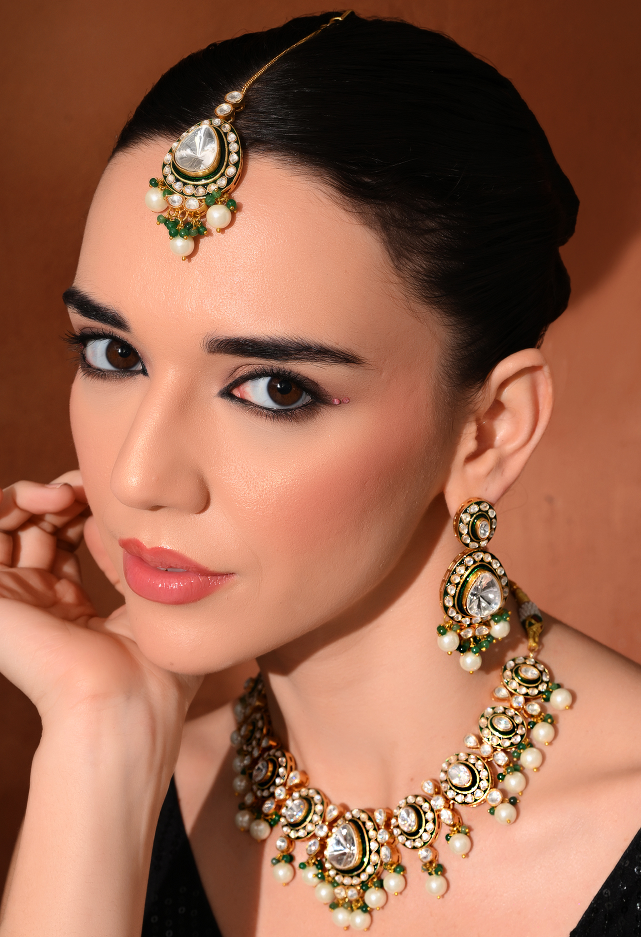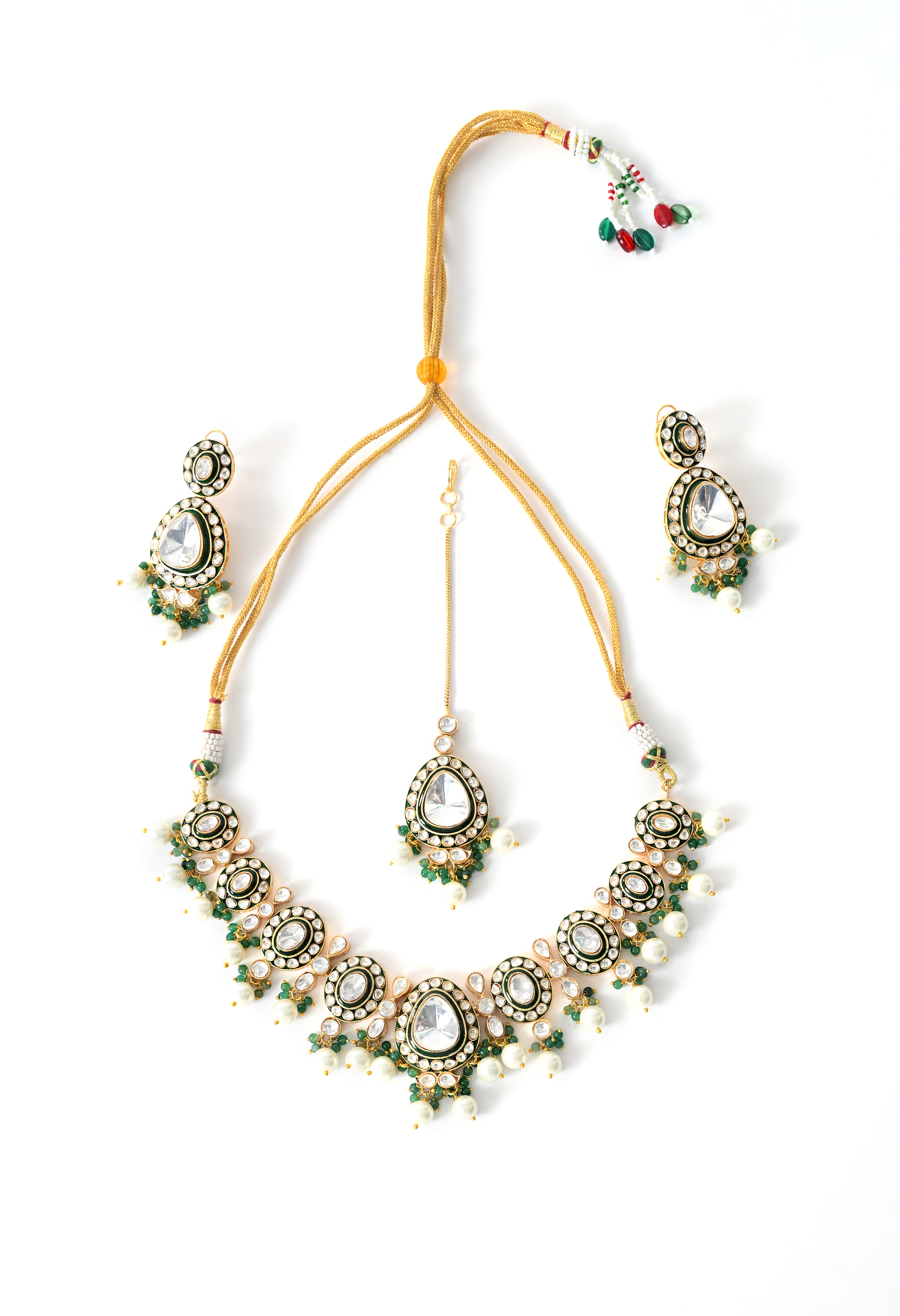 Complete necklace set with earrings and mangtika, crafted with green stones and gold plating. Designed for brides and grand festive occasions.