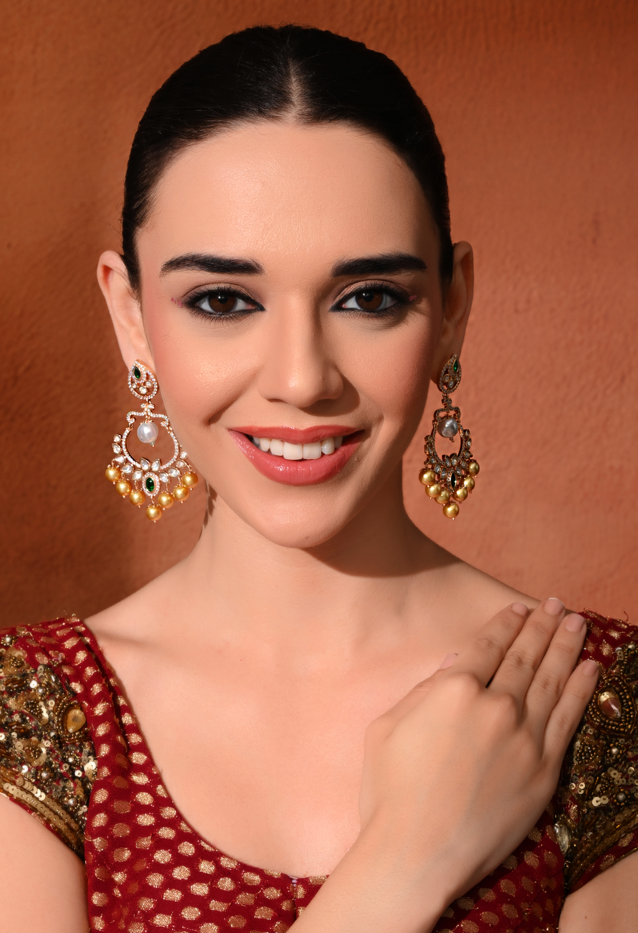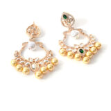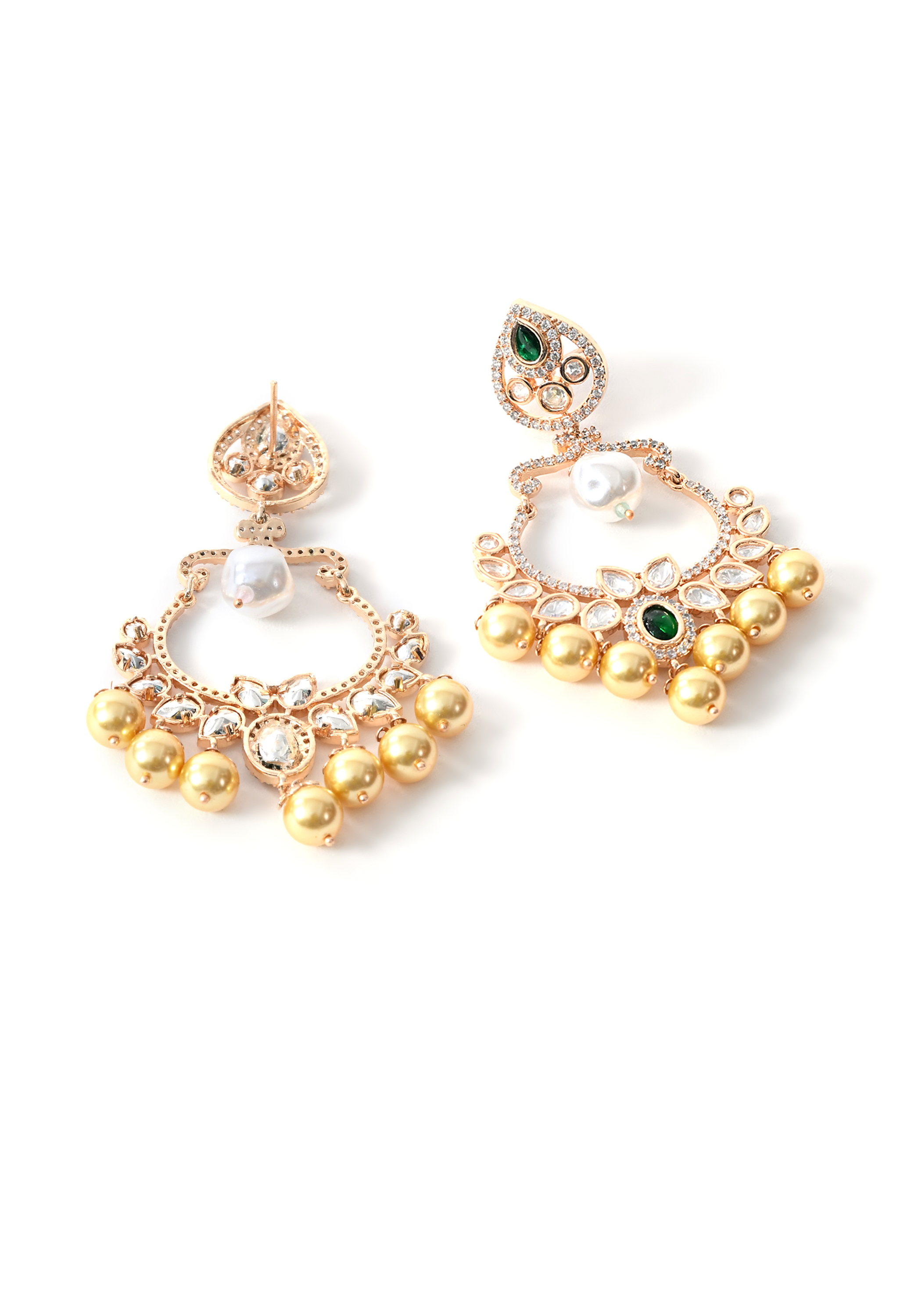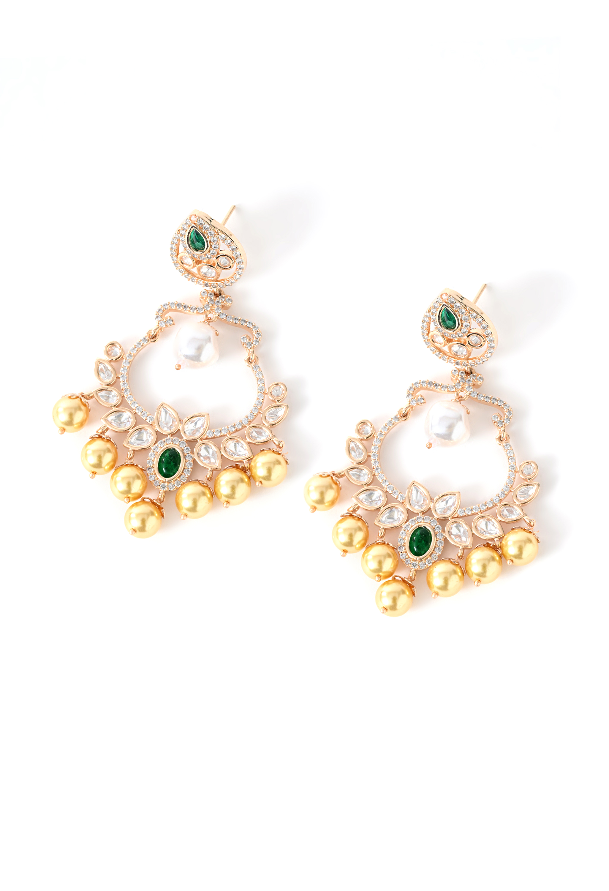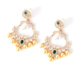 Bold and beautifully crafted danglers with green stones and intricate gold-plated detailing. Ideal for weddings and festive occasions.